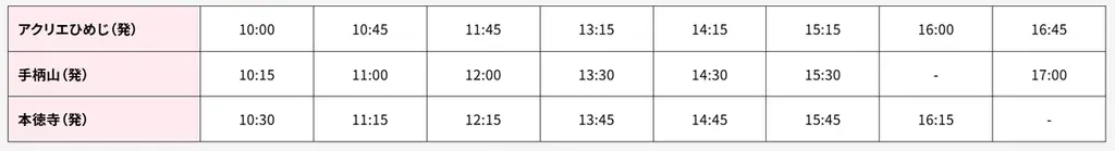 当日は神姫バスが無料のループバスを2ルートで運行し、撮影エリア間の移動をサポートします。各ルートともアクリエひめじ発着で、撮影スケジュールに合わせて効率的な移動が可能です。