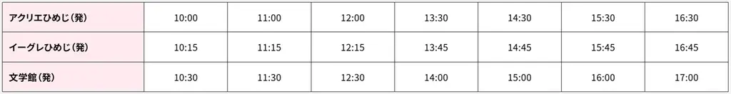 | アクリエひめじ →(15分)→ 手柄山(3分)→(10分)→ 亀山本徳寺(2分)→(15分)→ アクリエひめじ | アクリエひめじ →(12分)→ イーグレひめじ(3分)→(10分)→ 姫路文学館(5分)→(15分)→ アクリエひめじ |
