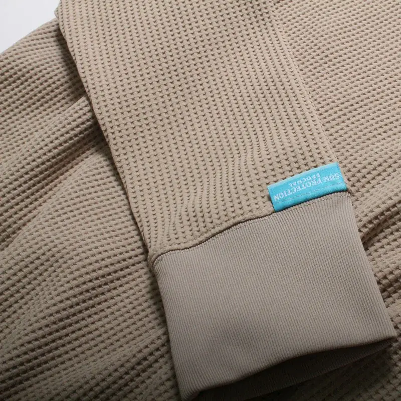 生地は特殊なUVカットワッフル素材で、UVカット率は96%。さらに吸汗速乾性にも優れており、汗を素早く拡散して肌に残りにくく、春先から秋までの気候変化に対応するほどよい厚みを持っています。トレーナーほどの地厚さはなく、程よいボリューム感で季節の変わり目にも着用しやすい設計です。