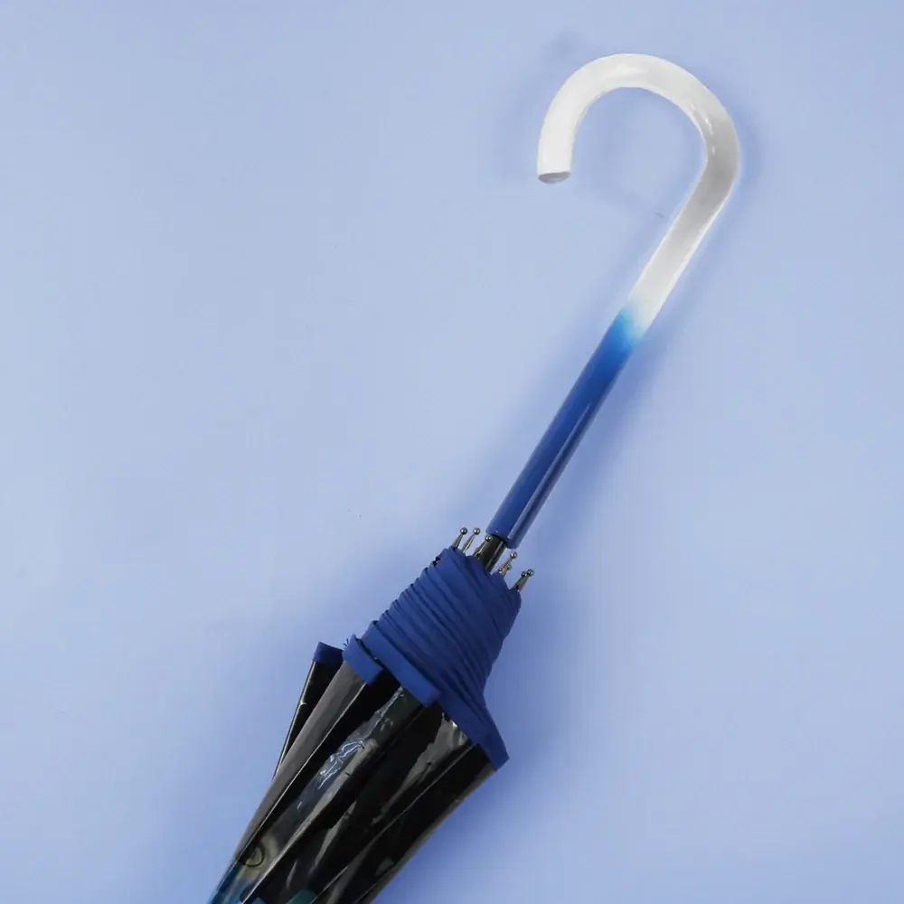 主な特長 ステンドグラス風の透明感あるデザイン、クリア素材の持ち手、グラスファイバー骨の採用、バイアステープ縁