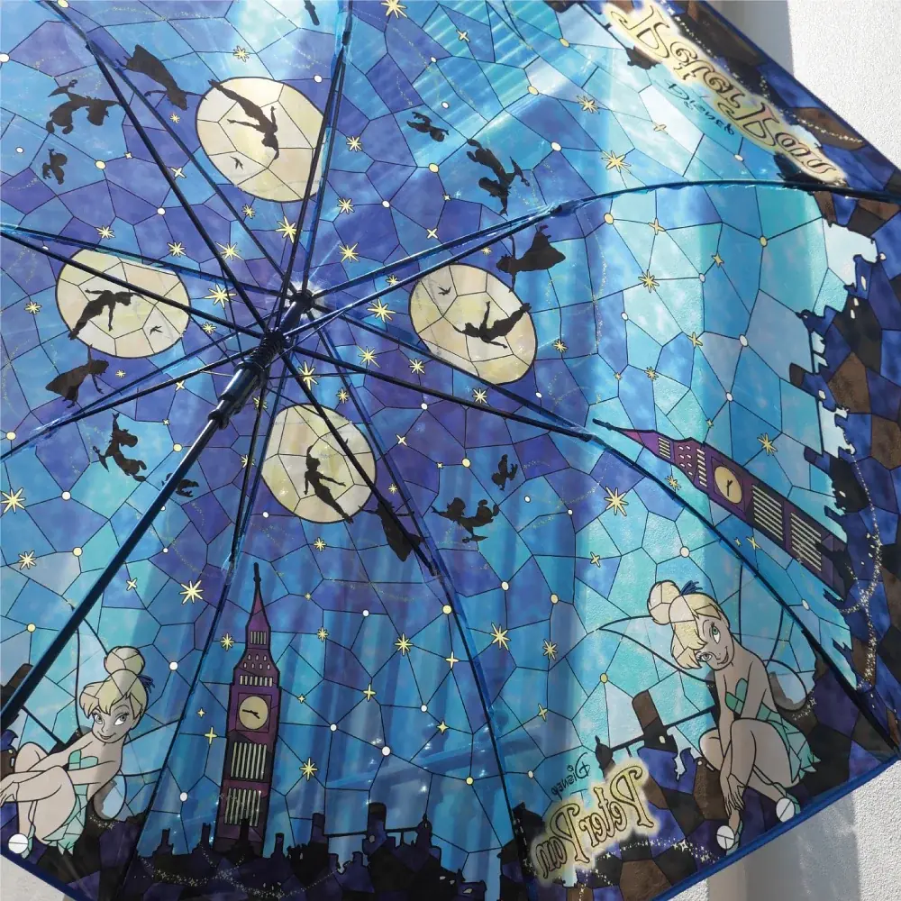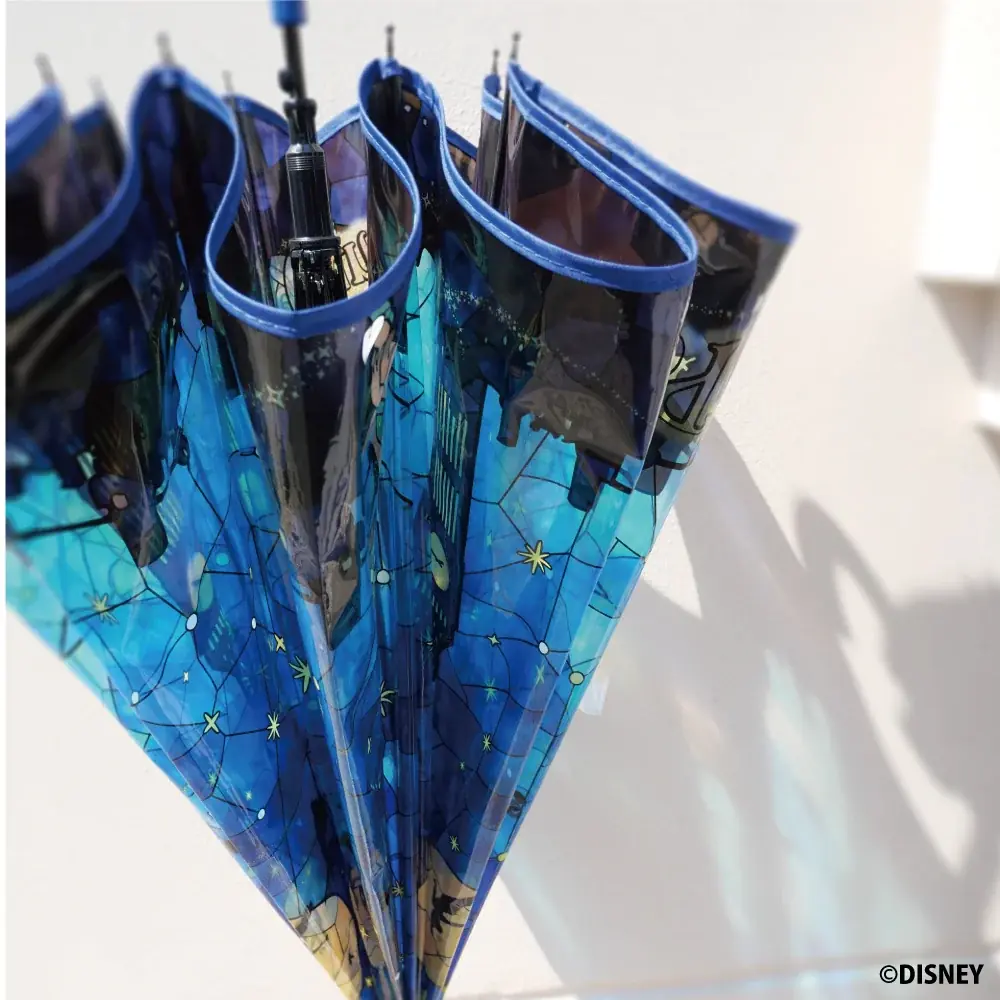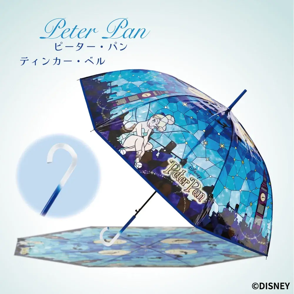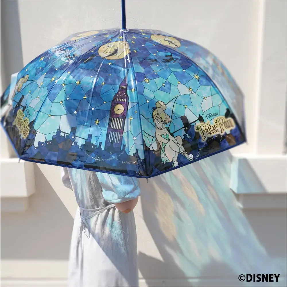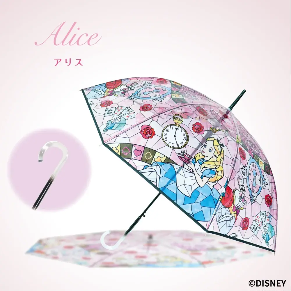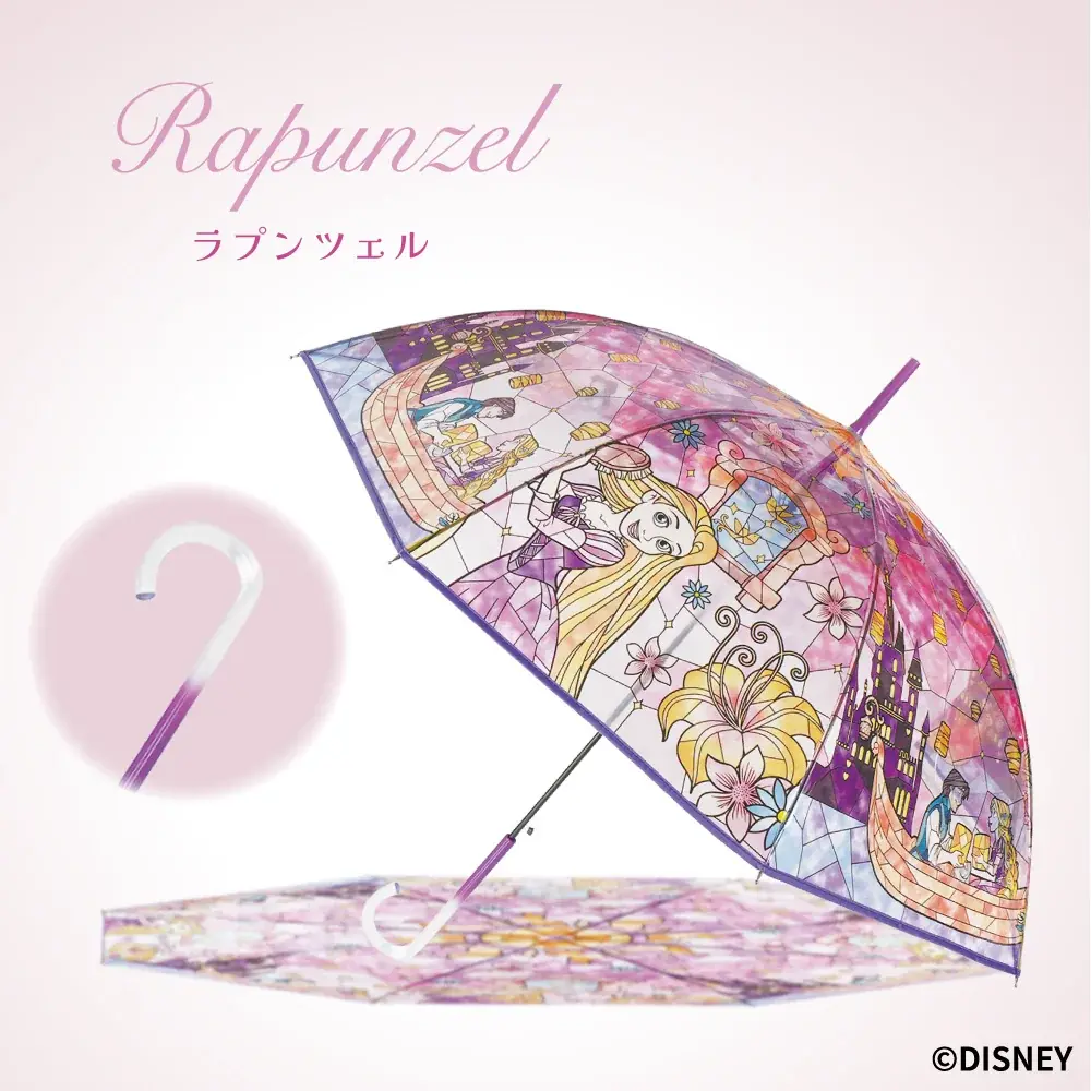 アリエルやアリス、ラプンツェル等7柄のステンドグラス風デザイン。親骨60cm、持ち手はクリア、グラスファイバー骨採用で軽さと耐久性を両立しており日常使いしやすい仕様です。