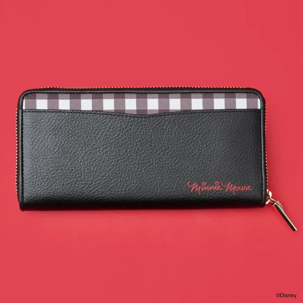 財布は折財布(¥24,200)と長財布(¥26,400)の2種類が展開されます。左側にミニーマウスのイラストをプリントし、上部のチェック柄とリボンのチェック柄が統一感を持たせています。内側にはフィガロのアートがプリントされており、開けたときのデザインにも配慮されています。