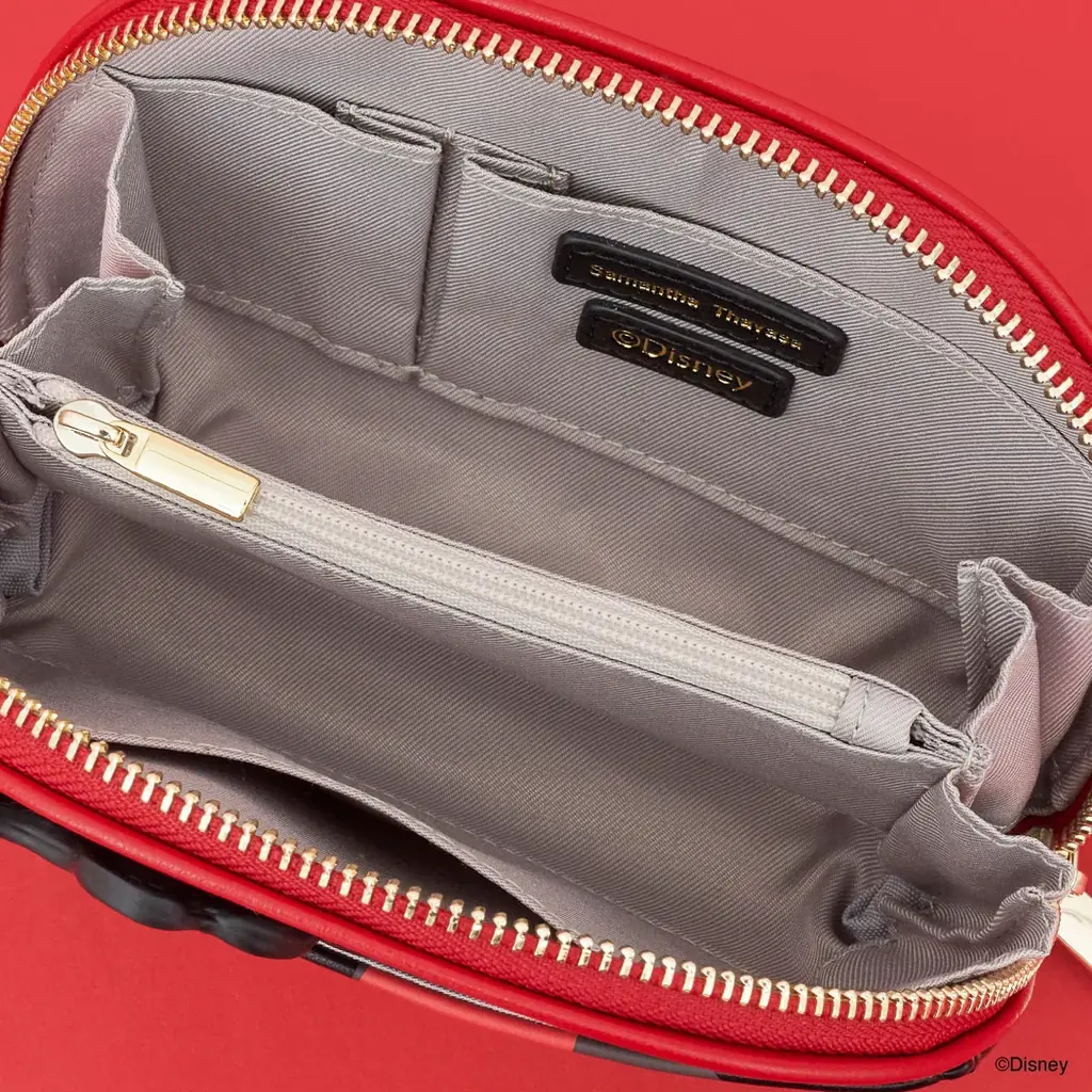 裏地にはミニーマウスのリボンに用いられているチェック柄をモチーフとし、内側も楽しめる仕様になっています。またバッグ背面には「フィガロ」デザインがあしらわれ、表情やディテールの見せ方に工夫があります。