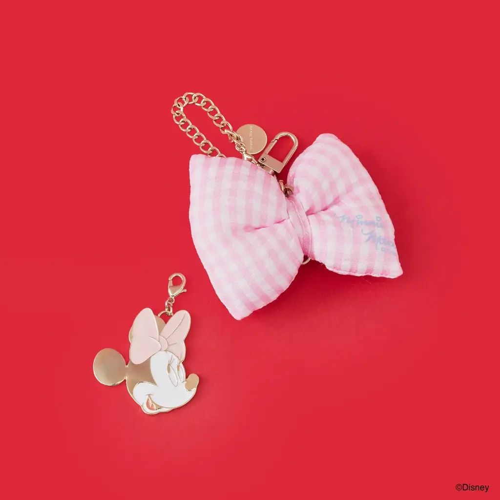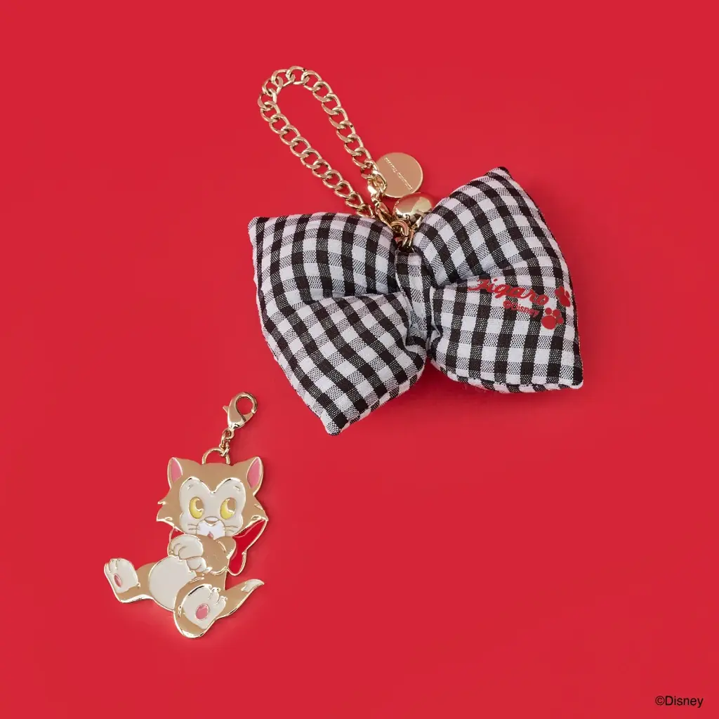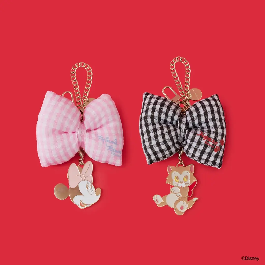 バッグチャームは「ミニーマウス」と「フィガロ」の2デザインが登場します。ミニーマウスにはピンクのチェック柄、フィガロはブラックのチェック柄が採用されています。
