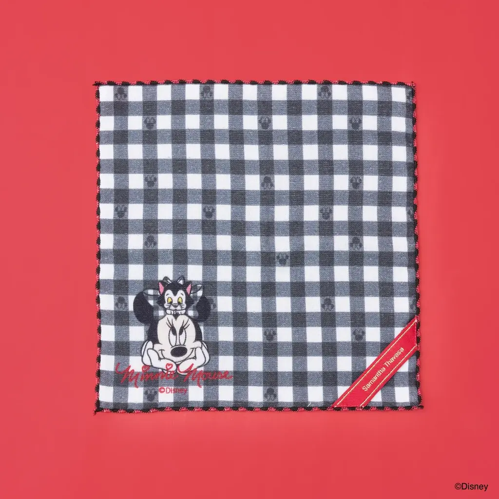 ハンカチはチェック柄をベースにしたミニーマウスとフィガロのアートを配したデザインです。チェックの中にはミニーマウスのシルエットが組み込まれており、1枚で多面的に楽しめる仕様になっています。