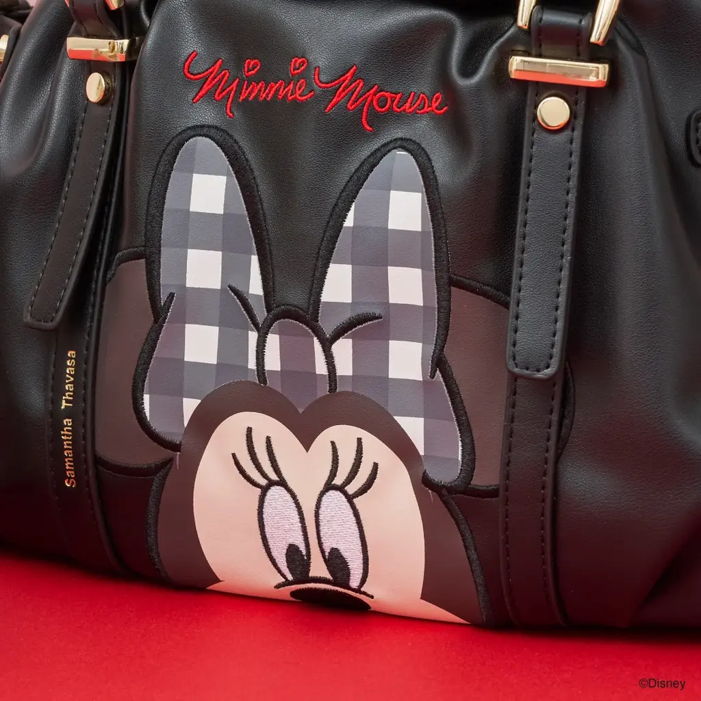 「ミニーマウス」コレクション ハンドバッグは、サマンサタバサの人気ハンドバッグに「ミニーマウス」の刺繍とプリントを組み合わせ、フロントに立体感のあるデザインを施した点が特徴です。ホワイト側はライトブルーの“Minnie Mouse”表記、ブラック側はレッドの“Minnie Mouse”表記が入ります。