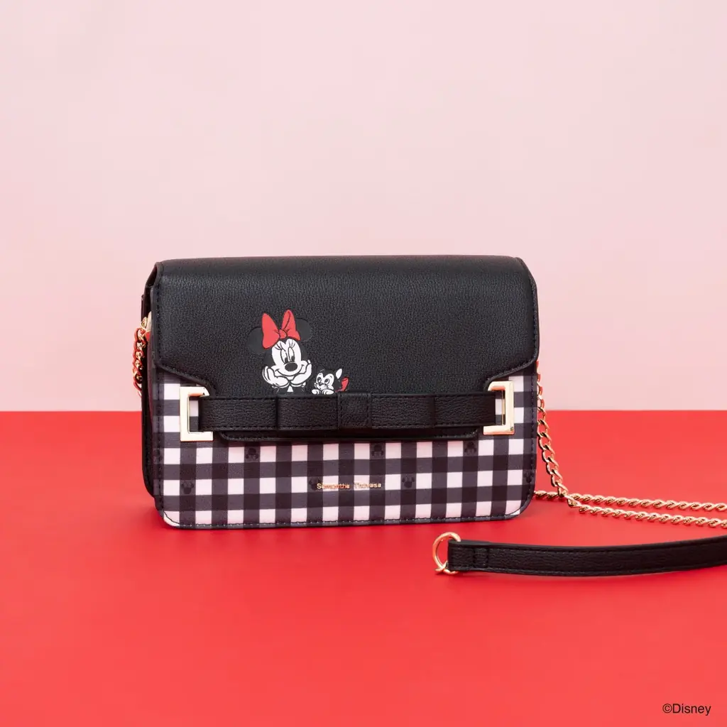 「ミニーマウス」コレクション ショルダーバッグはチェック柄を基調に、ミニーマウスとフィガロが見つめ合っているアートが施されたデザインです。全体的に愛らしさを意識した配色・アートワークで、日常使いからお出かけまでの幅広いシーンで使いやすい設計です。