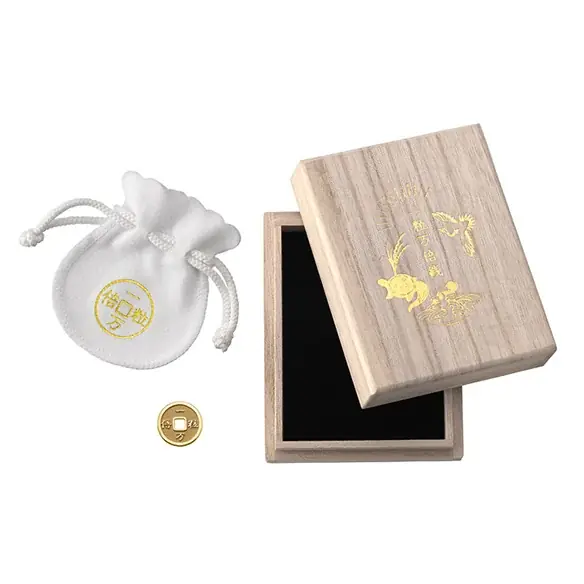 「純金 一粒万倍銭 1g」の好評を受け、要望に応じて2023年から販売を開始した5gタイプです。携帯しやすいポーチが付属し、桐箱の付属を含む仕様で提示されています。