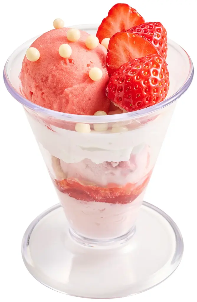 構成は苺のアイス、苺シャーベット、苺ソース、苺ムース、そしてフレッシュ苺が重なる“苺づくし”のパフェです。複数の苺素材を組み合わせることで、甘さと酸味、冷たさと滑らかな口当たりが層ごとに変化します。