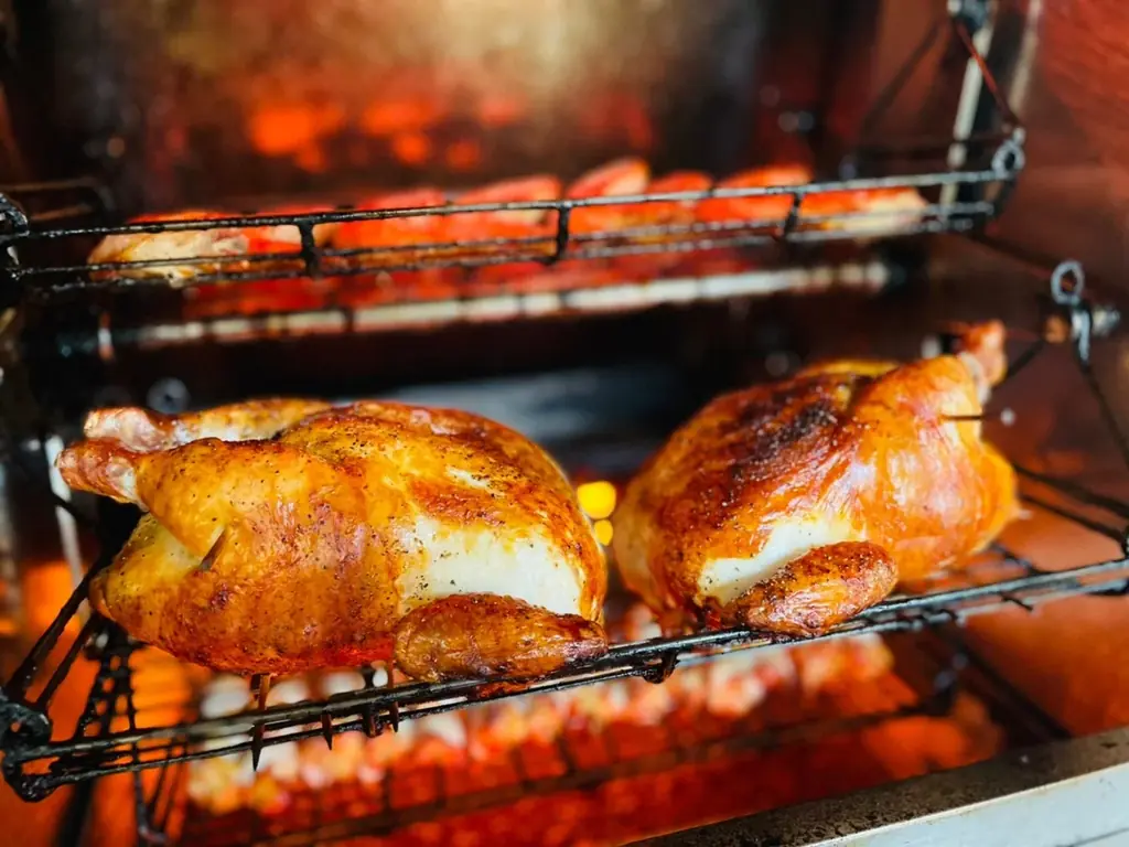 ロティサリーオーブンで回転させながら焼くことで余分な脂が落ち、下部で脂を受けることで脂の旨味が凝縮されます。味付けはシンプルながら深みのある仕上がりとなり、冷めても固くならず、胸肉でもパサつかない点が特徴です。