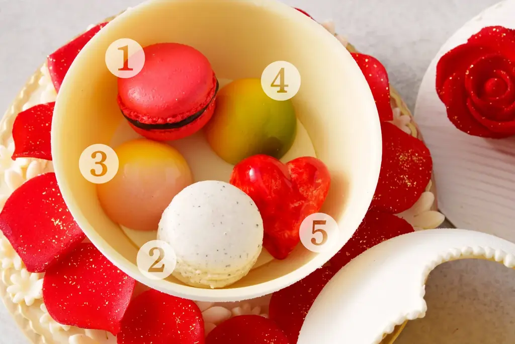 ボックス本体はホワイトチョコレートで形成されており、リボンや装飾、蓋のバラに至るまで食べられる素材で仕上げられています。箱を開ける演出そのものがスイーツの一部になるよう設計されています。