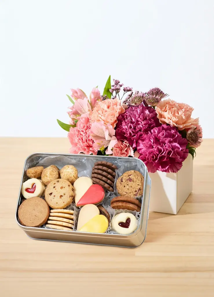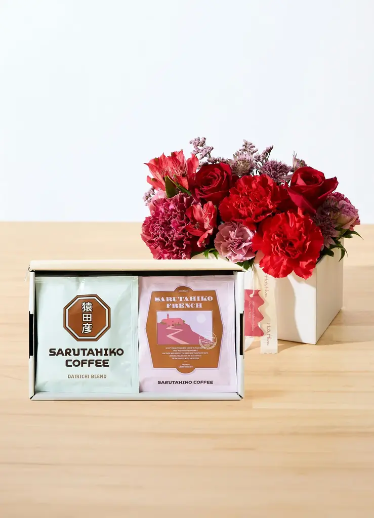 • ブランドセット例:DEAN & DELUCAのクッキー缶+カーネーションアレンジ、猿田彦珈琲のドリップバッグ+バラとカーネーションのアレンジ