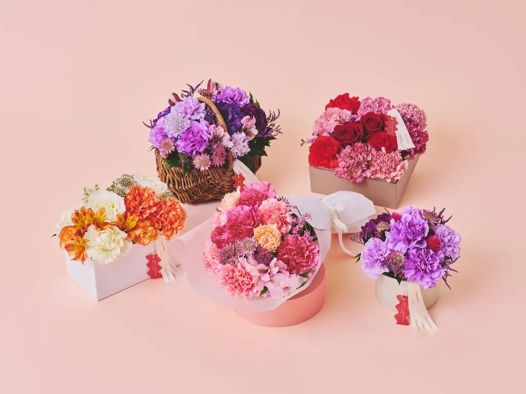 カーネーションはピンク・レッド・オレンジ・ブルーパープルの4色展開。ほかに胡蝶蘭、バラ、あじさい、ガーベラ、鉢植えや観葉植物、人気ブランドセットも揃います。