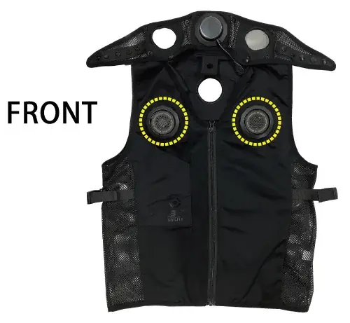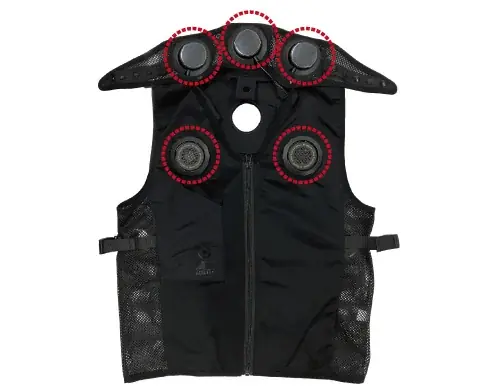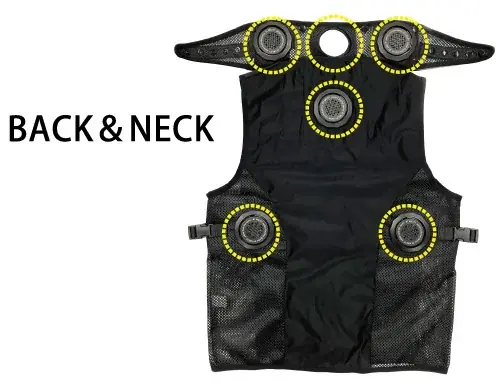 • 配置の自由度:ベスト部分に5箇所、ネックカバー部分に3箇所の設置位置を用意。首・胸などの重要部位をピンポイントで冷却可能。