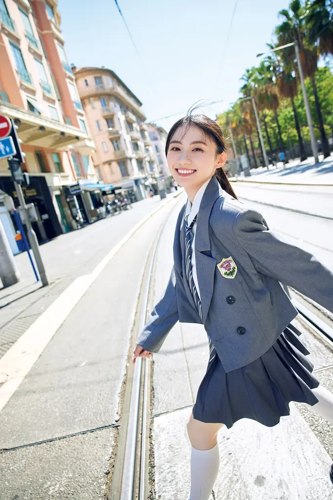 通常版:制服風衣装でニースの街を歩くカット