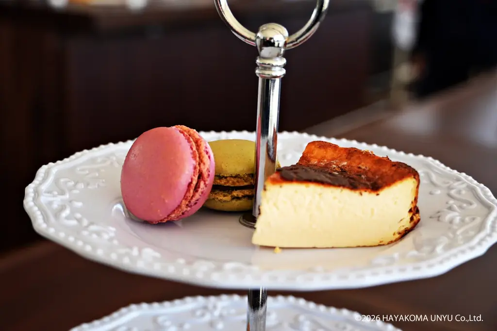 Afternoon Teaセットのメニューは見た目にも華やかで、ショコラタルト、いちごババロア、マカロン、チーズケーキに加え、ミニパテバーガー、ローストビーフ、ロースト野菜など甘味と軽食のバランスが取れた構成です。