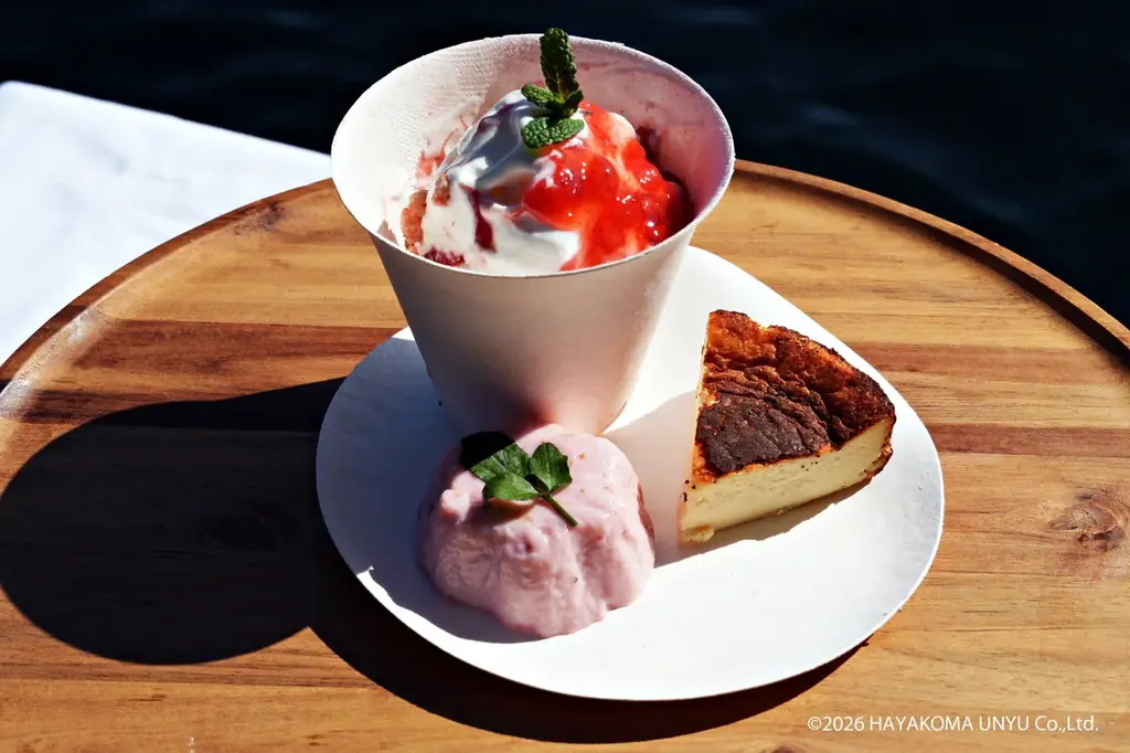 • Mini Afternoon Tea Plan:ミニパフェ、チーズケーキ、いちごババロアを含むセット + 大人1名乗船券。価格は4,000円(税込/大人1名)(ペア割対象外)