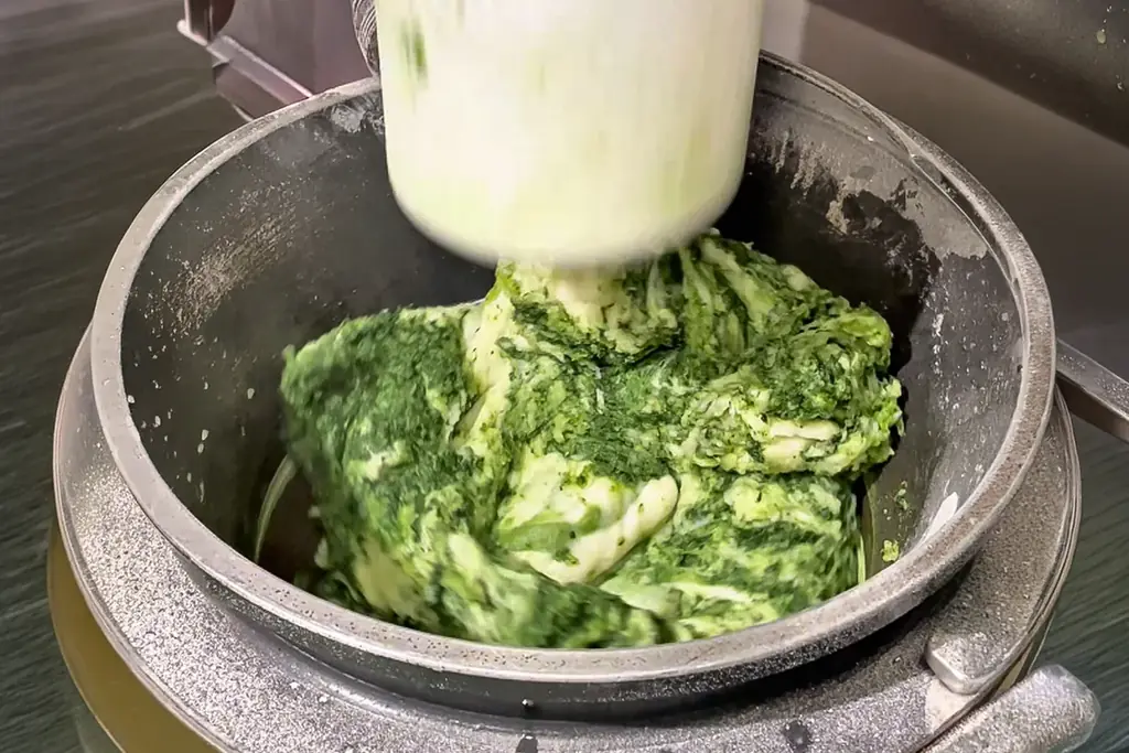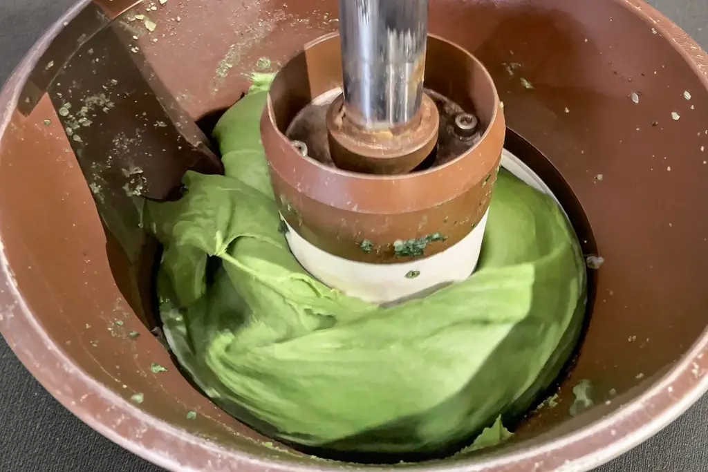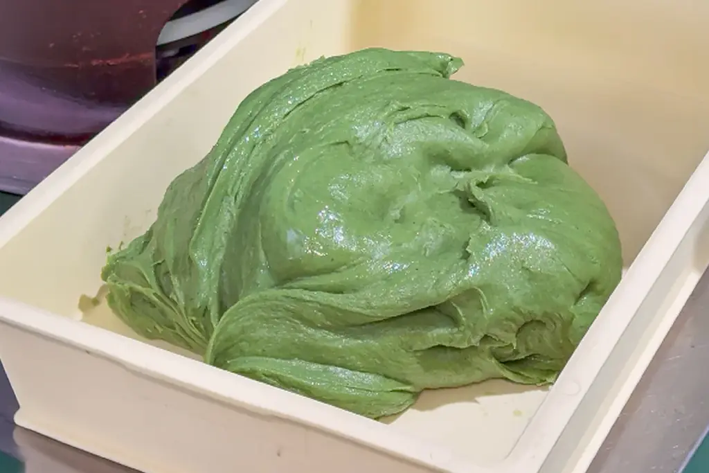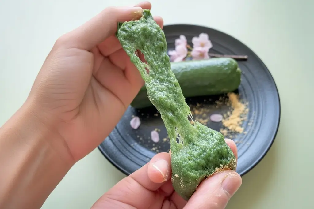 使用する米は千葉県産のうるち米コシヒカリのみ。上新粉などの粉ものは使わず、原料はうるち米・よもぎ・水だけで、蒸篭(せいろ)で蒸してから杵と臼でつく伝統的な製法で仕上げます。蔵王連峰産の香り高いよもぎをたっぷり使用しており、色と香り、繊維の細かさが特徴とされています。
