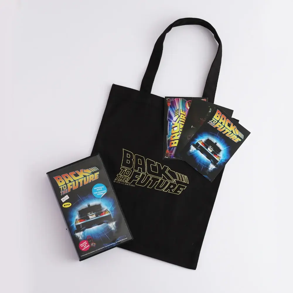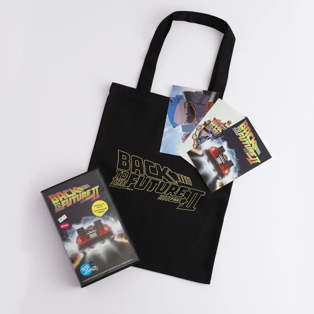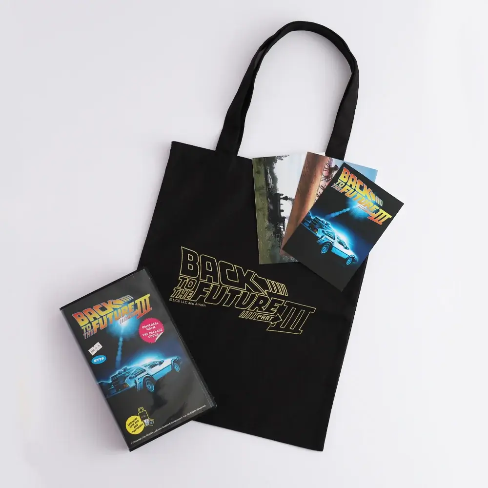 VHSケースにトートバッグが収まる仕様のセット商品で、ポストカードが3枚付属します。VHSのパッケージデザインを模した収納ケースが特徴で、コレクション性と実用性を兼ね備えたアイテムです。
