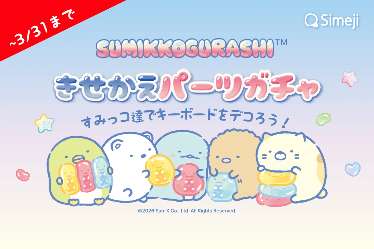 バイドゥ株式会社が提供するきせかえ顔文字キーボードアプリ「Simeji」(iOS/Android)は、2026年3月11日(水)18:00から同年3月31日(火)23:59まで、『すみっコぐらし』とのコラボレーションキャンペーンを実施します。プレスリリースはバイドゥ株式会社(本社:東京都港区、代表取締役社長:Feng Jiang)より、2026年3月11日18時00分に発表されています。