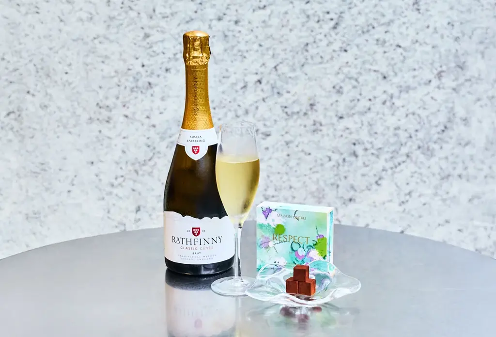 このペアリングでは、アロマ生チョコレート「ル・レクチェ」と「ラスフィニー ヴィンテージ クラシック キュヴェ 2018」が組み合わされています。ル・レクチェは、芳醇な香りと滑らかな食感が特徴の洋梨で、スパークリングワインとの相性が抜群です。その柔らかな口あたりと酸の爽やかさが、ル・レクチェの香りの余韻を長く優しく広げます。