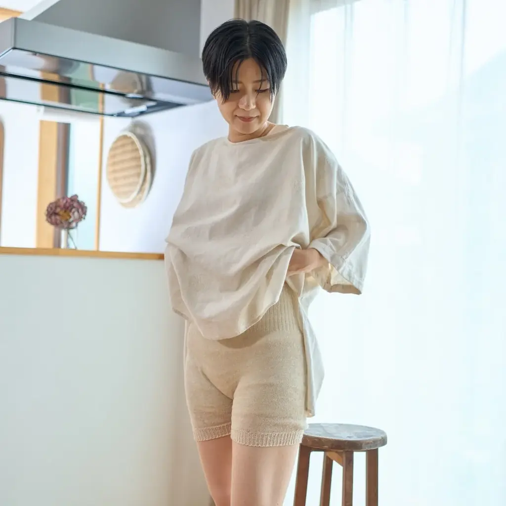 「そよ風はらぱん」は、ざっくりと編まれたデザインが特徴で、編み目の間に空気が通ることで、熱や湿気がこもらず、爽やかな着心地を実現しています。身につけた際もつっぱらず、柔らかい着用感が得られ、「温める」のではなく「冷えから守る」という新しい発想から生まれた構造です。