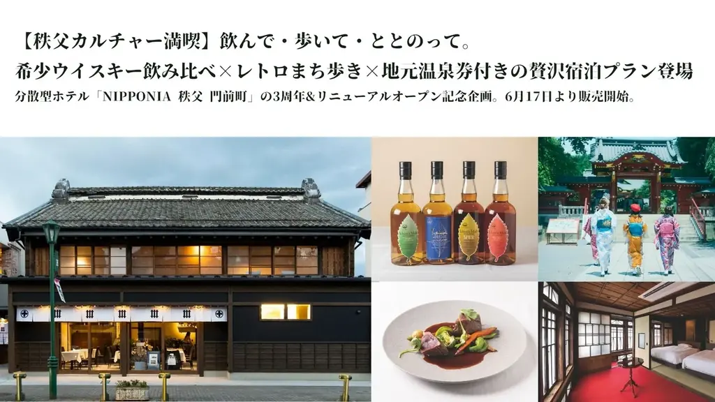分散型ホテル「NIPPONIA 秩父 門前町」の3周年とリニューアルオープンを記念した特別な宿泊プランが、2025年6月17日より販売開始されます。このプランは、秩父の魅力を存分に味わえる内容となっており、ウイスキーの飲み比べやまち歩き、地元温泉券がセットになった贅沢な体験を提供します。
