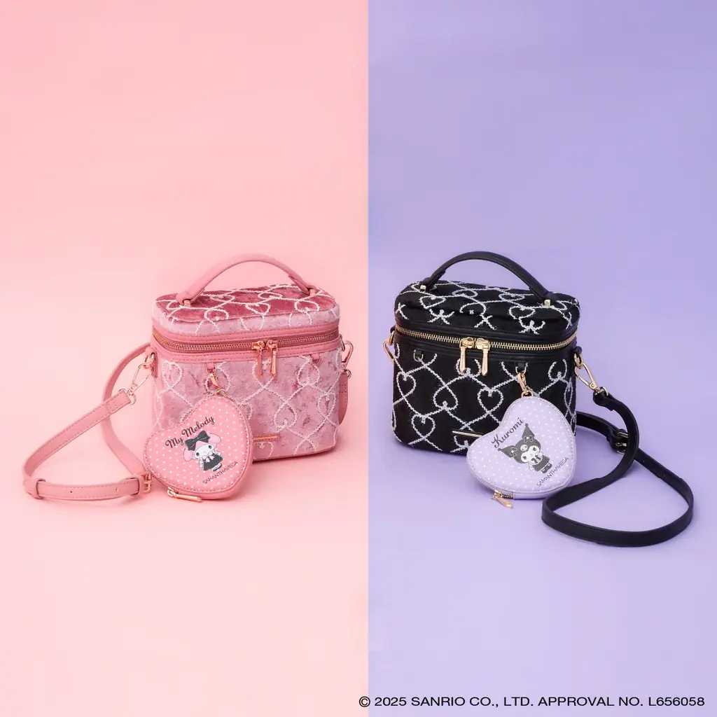 2. 「マイメロディコレクション」と「クロミコレクション」のバニティバッグは、コロンとした丸いフォルムが可愛いデザインです。各コレクションは、それぞれのキャラクターをイメージした色合いで、光沢感のあるベルテッド調の素材を使用しています。価格は19,800円です。