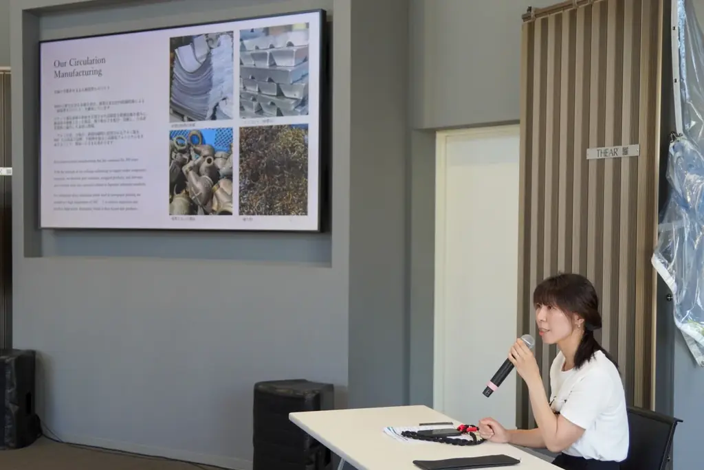 次に登壇した高下裕子氏は、金森合金の伝統的な砂型鋳造技術と循環型ものづくりについて説明しました。1714年に創業し、300年以上の歴史を持つ同社は、災害廃材の活用に取り組んでおり、能登半島地震の後、廃材を利用したプロダクトの開発に方針を切り替えました。