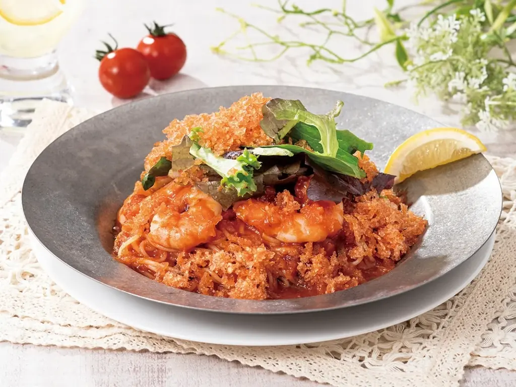 新感覚の冷製パスタで、程よいコクのトマトソースの上に、凍らせたトマトジュース「トマトフラッペ」をトッピング。最初はシャリシャリした食感が楽しめ、時間が経つにつれてソースが溶けて絡み、さっぱりとした後味が広がります。