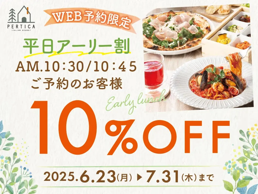 新メニューを楽しむチャンスとして、2025年6月23日(月)から7月31日(木)までの期間、平日限定で「アーリー割」キャンペーンが実施されます。このキャンペーンでは、平日AM10:30または10:45に予約をしたお客様に限り、料理代が10%OFFになります。