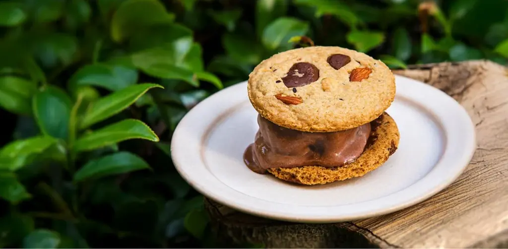 クッキーアイスサンドは、植物性ミルクベースの濃厚なチョコレートアイスを、グルテンフリーで白砂糖不使用のクッキーで挟んだ、健康志向のひんやりデザートです。