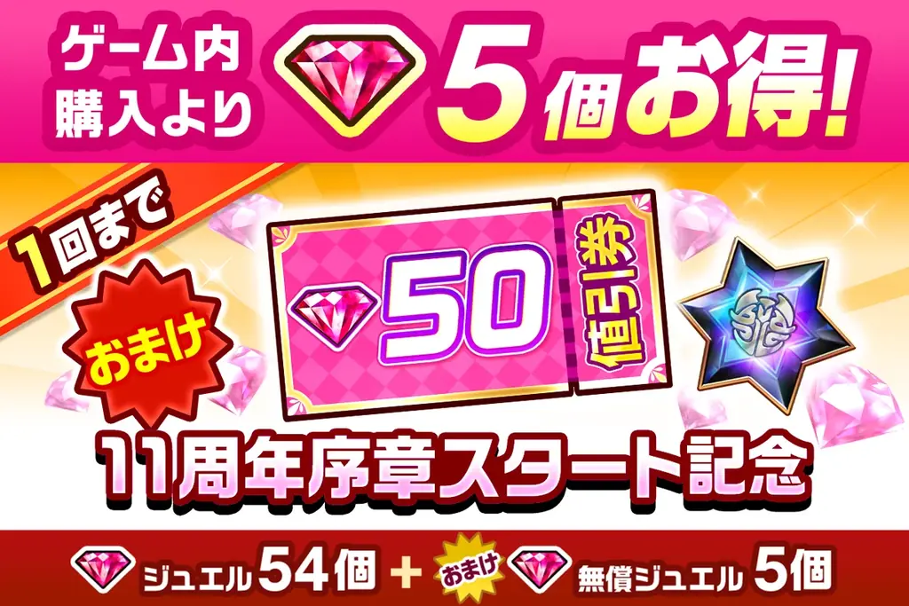 値引券付きジュエルパック 800円 「ジュエル」54個、「無償ジュエル」5個、「ジュエル50個値引き券」、「EXルーン」1個