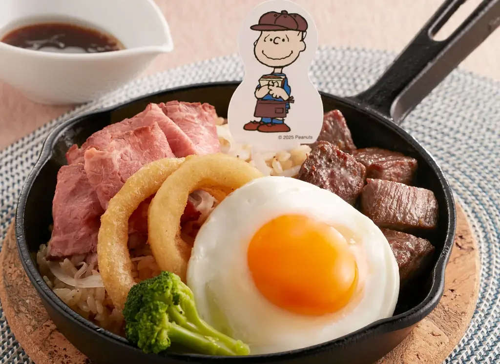 ローストビーフ、サイコロステーキ、オニオンリング、目玉焼きがトッピングされた賑やかなガーリックライス。 - チャーリー・ブラウンとルーシーの仲良しローストビーフつけ麺 – 999円(税込:1,098円)