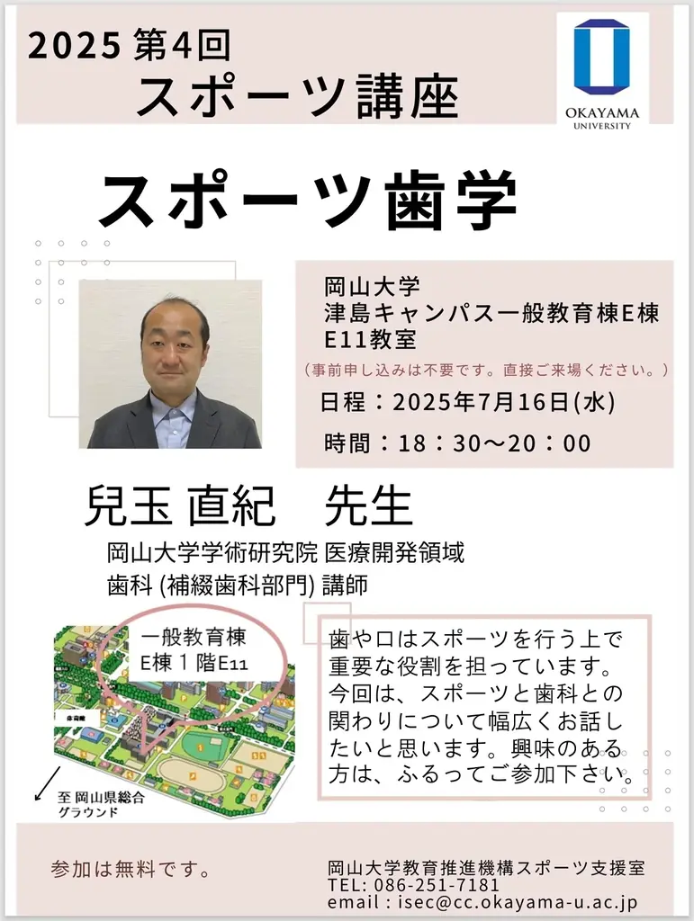 2025年7月16日に岡山大学津島キャンパスで開催される第4回スポーツ講座「スポーツ歯学」についての情報を以下にまとめます。