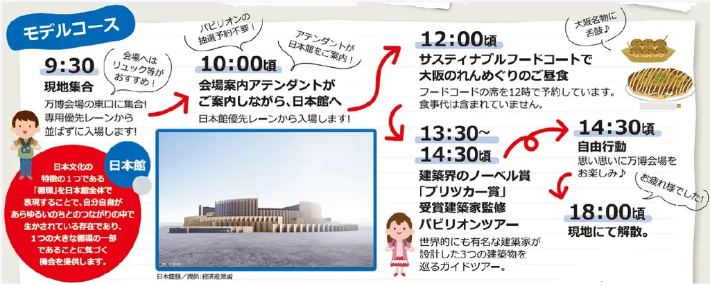 - 含まれるもの:大阪・関西万博入場チケット、日本館優先入場券、サスティナブルフードコート席料、建築家監修パビリオンツアー