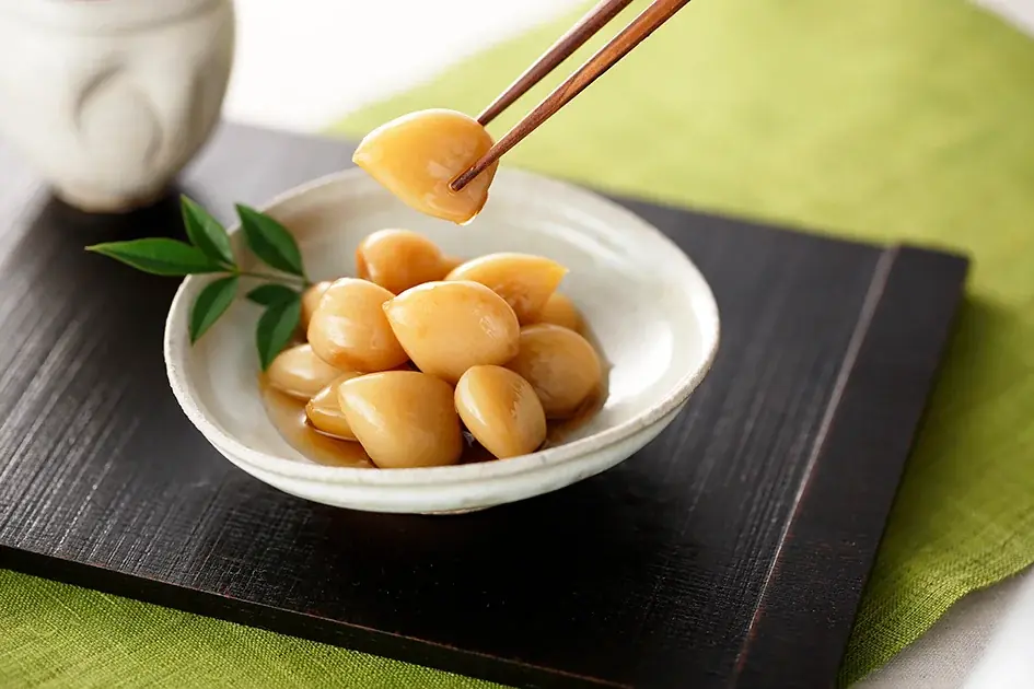 毎年5月に収穫される有機「にんにく王」を使用した新漬けの「梅にんにく」は、シャキッとした心地よい食感が特徴です。ひと粒口にすると、芳醇なにんにくの香りと南高梅の甘酸っぱさ、さらに鰹節のうまみが広がります。これにより、ついつい箸が止まらなくなる美味しさを実現しています。