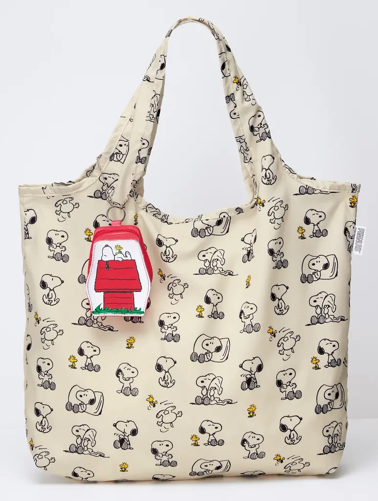 - ポーチ型チャーム: エコバッグには、ドッグハウスの屋根でお昼寝するスヌーピーのデザイン、または愛らしいおすましフェースのスヌーピーのデザインのポーチ型チャームが付いています。