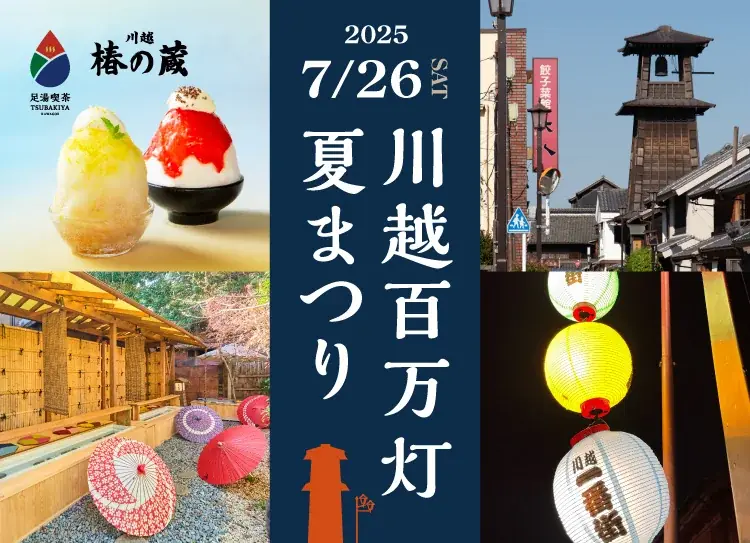 川越百万灯夏まつり | 2025年7月26日(土) | 本川越駅周辺~札の辻交差点 | 足湯喫茶TSUBAKIYAの夏季限定メニュー(かき氷、冷やししるこなど) | 西武新宿線「本川越駅」より徒歩16分 |