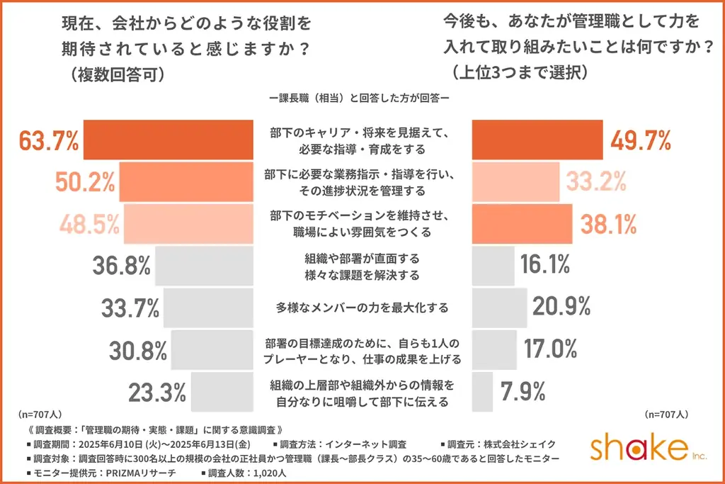 最近の調査によると、管理職が若手や中堅社員のリーダーシップを発揮させるために必要な要素として、「成功体験」や「権限委譲」が挙げられています。株式会社シェイクは、300名以上の規模の企業における正社員で管理職(課長~部長クラス)の35~60歳の方を対象に、「管理職の期待・実態・課題」に関する意識調査を実施しました。この調査は、2025年6月10日から6月13日まで行われ、1,020人が参加しました。