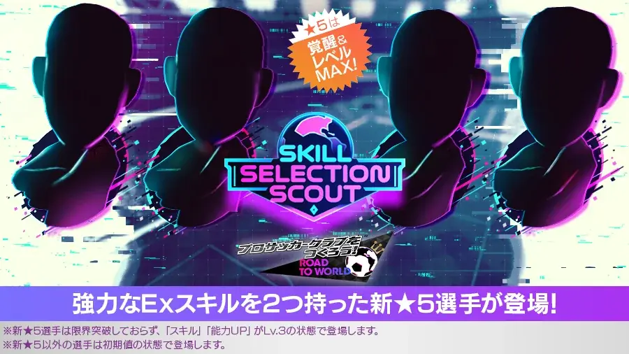 さらに、特典付きスカウト“SKILL SELECTION SCOUT”も同時に開催されます。このスカウトでは、★5選手が「レベルMAX(Lv.50)/覚醒2段階達成/各スキル・各能力UP Lv.3達成」の状態で登場します。スカウトの詳細は以下の通りです。