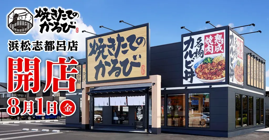 株式会社物語コーポレーションは、2025年8月1日(金)に静岡県浜松市に32店舗目となる「焼きたてのかるび 浜松志都呂店」をオープンします。この新店舗は、熟成肉を使用した「焼きたてのカルビ丼」と「ユッケジャンスープ」を専門とした飲食店です。