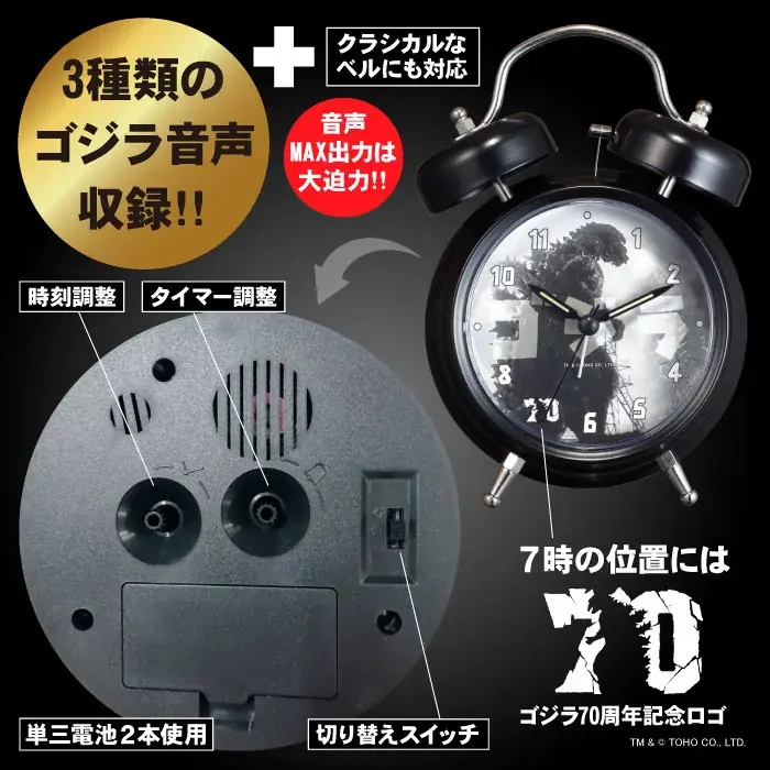 この商品は、3種類のゴジラの音声と懐かしのベル音を搭載しており、70年の時を超えてゴジラがあなたを目覚めさせるというユニークなコンセプトが魅力です。特に、1954年当時の貴重な音源を使用しているため、ファンにとっては非常に価値のある商品となっています。