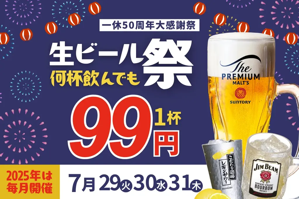 生ビール99円祭り | 2025年7月29日~31日 | 生ビール、ハイボール、レモンサワーが税込99円 |