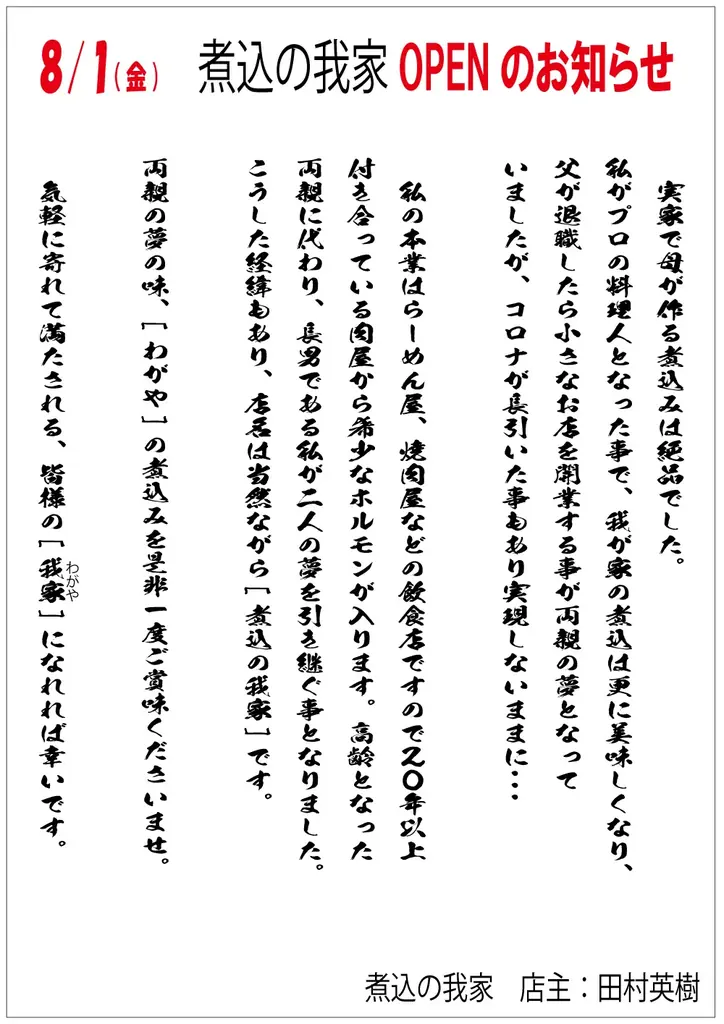 新たにオープンする「煮込の我家」は、両親の夢を引き継ぎ、地域の皆様に愛される煮込み料理の専門店として、信州味噌を使用した極上のモツ煮込みを提供します。店内のオシャレな雰囲気や、家庭的なサービスも魅力の一つです。以下に、店舗の概要をまとめました。