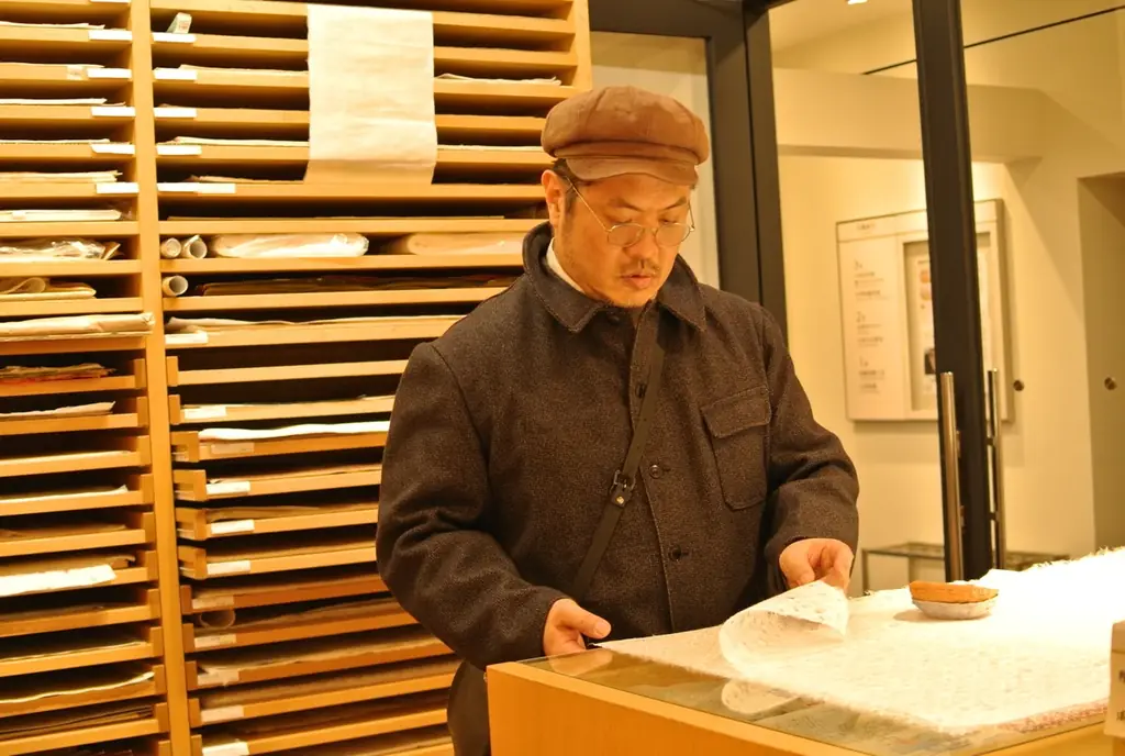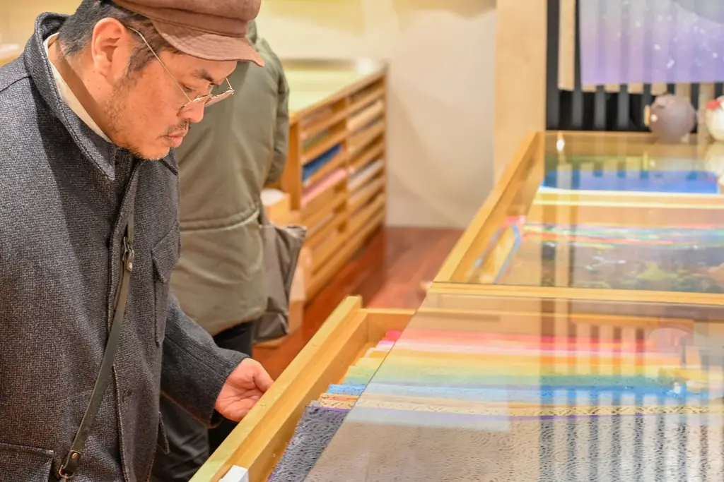 「小津和紙」から提供された和紙を使い、波紋のようなレース模様や雨粒が地面に広がったような特徴的な模様の和紙を選びました。これらの和紙は、彼の絵と調和し、装飾性を持ちながらもフラットな魅力を表現することができたとしています。