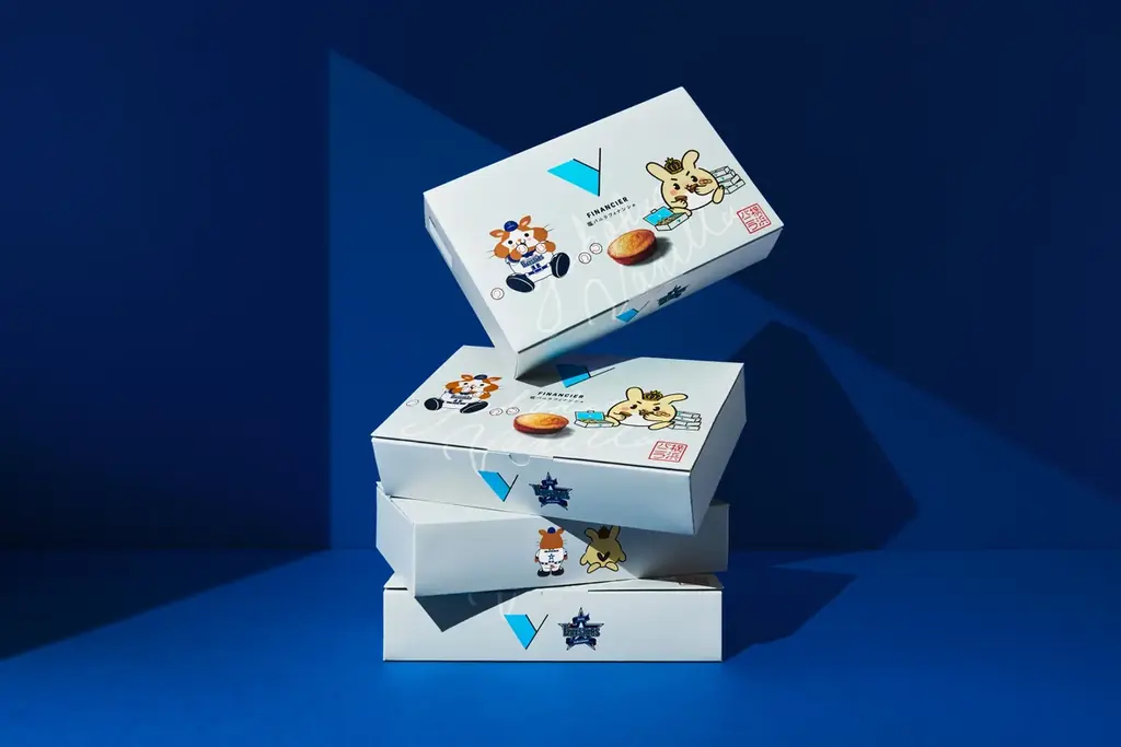「塩バニラフィナンシェ」のパッケージには、横浜DeNAベイスターズのマスコットキャラクター『DB.スターマン』と、横浜バニラのマスコットキャラクター『バニ丸』が描かれています。『DB.スターマン』は野球ボールを、『バニ丸』は「塩バニラフィナンシェ」を頬張る姿が愛くるしく表現されており、両者の個性を活かしたデザインが魅力です。