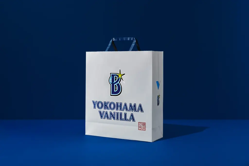 さらに、ショッパーには横浜DeNAベイスターズのエンブレムが正面中央に配置され、その下には横浜バニラのブランドロゴが調和するフォントで記載されています。持ち手部分には、ベイスターズのチームカラーである青が使用されており、特別感が演出されています。