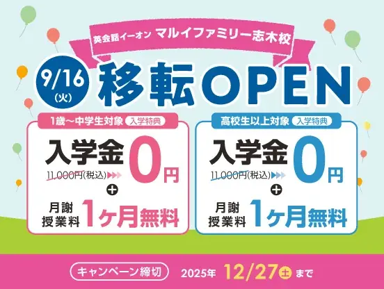 英会話教室を運営する株式会社イーオンは、2025年9月16日(火)に「イーオン志木校」を移転し、新たに「イーオン マルイファミリー志木校」としてオープンします。この移転に伴い、特別なイベントやキャンペーンが用意されています。