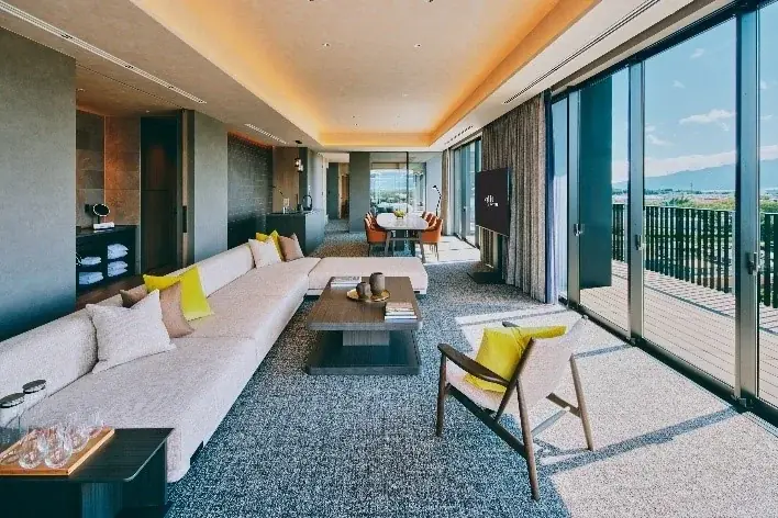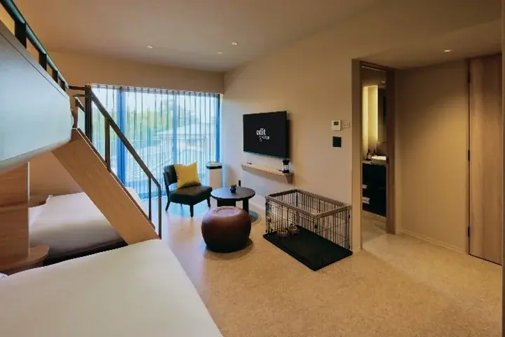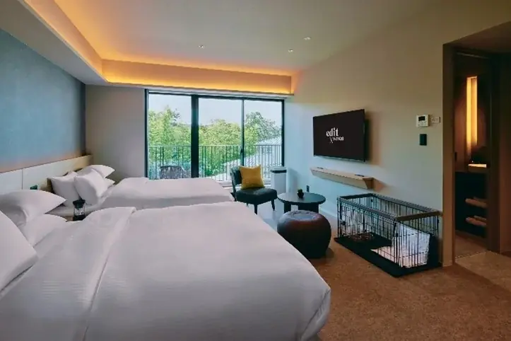 「edit x seven 富士御殿場」では、全49室の客室が用意されており、全9タイプから選ぶことができます。最大8名まで宿泊可能な広々とした157㎡のアイコニックスイートルームや、サウナ付き客室、愛犬と宿泊できるドッグフレンドリー客室を提供しています。
